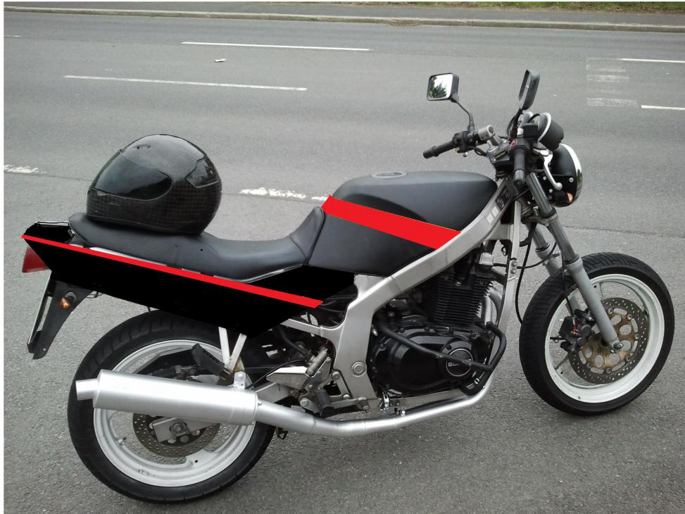 An der Heckverkleidung oder am Tank musst du unbedingt was machen...sieht aus wie ein notdürftig reparierter Unfallschaden.