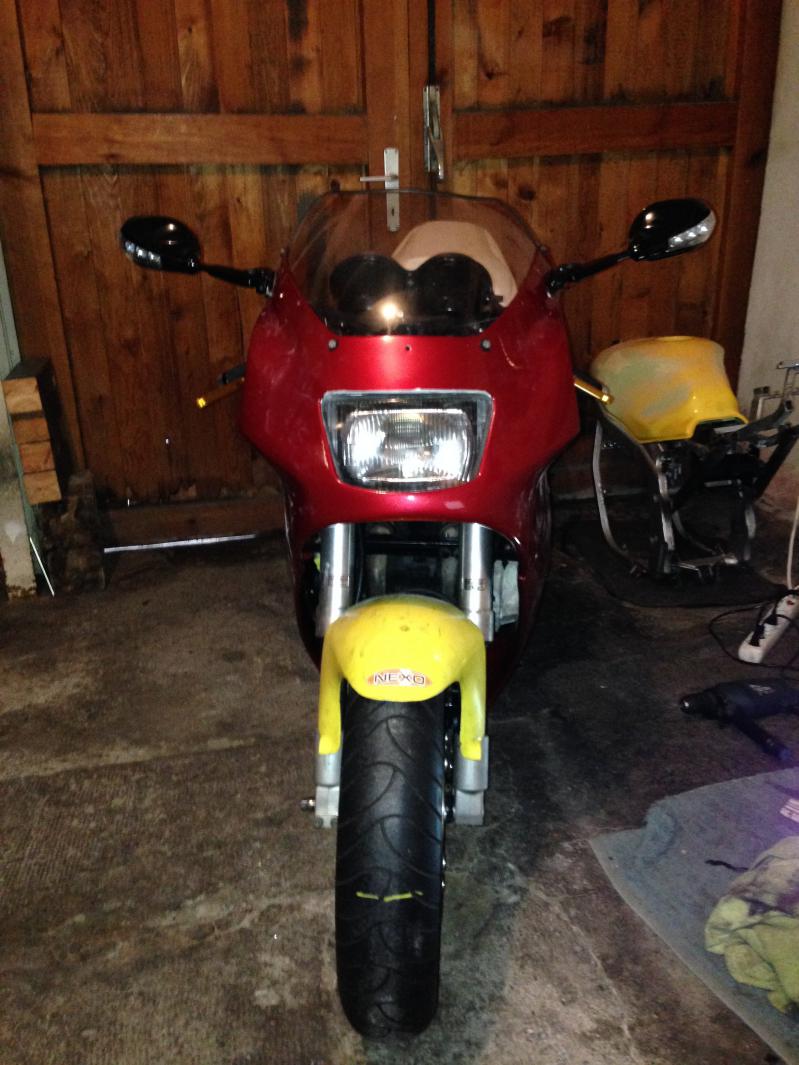 http://www.fahrerlebnis-bayern.de/fa...-360-panorama/ Zurück zum Umbau: Heute habe ich nochmal das ganze mit Gabel und Lenker am anderen Rahmen ,mit Motor drin, angebaut. Stellt euch noch die Vollverkleidung dazu vor. Der IXIL Shorty kommt noch knapp hinter der Fußraste raus - so wird sie dann wohl aussehen ![]() Next step: Kabelbaum anpassen und z.t. neu verlegen. Armaturen des neuen Modells an den alten Kabelbaum tüfteln, Kettenflucht beheben, Motor zum laufen bringen. |