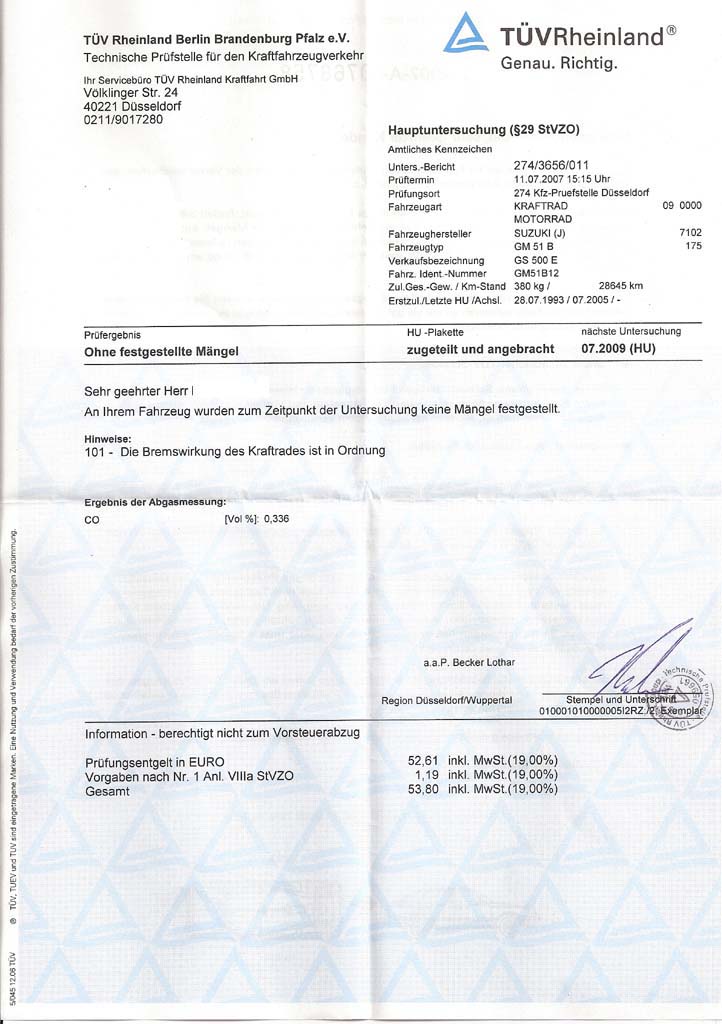 Meine war vor der Messung richtig warm gefahren. Hinzu kam dann noch die Probefahrt des Graukittels. Der war selbst Moppedfahrer und hat mit meiner Suzi fast 10 Minuten seine Runden auf dem dort vorhandenen, sehr großen Parkplatz gedreht.