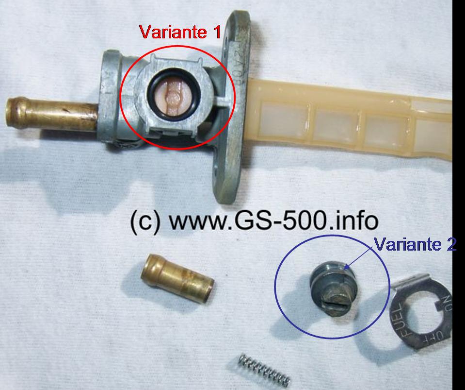 mein oberer Benzinhahn leckt. Jetzt habe ich ihn aufgeschraubt und gesehen, dass der O-Ring hin ist. Diesen möchte ich nun ersetzen. Aber mein O-Ring war in der Nut des Drehelements (siehe Bild Variante 2). Lt. gs-500.info kommt der O-Ring aber in den Hahn wie in Variante 1 im Bild.