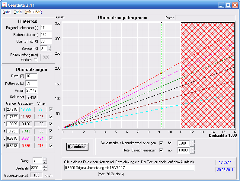 Tschuldigung! Du hast nat. recht! I.wie habe ich mit geardata mal rumgespielt -und da war das die "Voreinstellung! bei mir. Jaja die gs sieht bei 10.500 noch lange nich rot! Aber dass Dein Tacho mit Welle ca. 400 Umdrehungen vor geht musst Du mir mal erklären -kann es sein Du meinst den DZM? Oder rotiert Deine Tachonadel und Du zählst mit??? @majestic_morpheus Stimmt! Du hast auch recht!! Tschuldigung xxl! Ich meinte 9200 nicht 10200! Um mal ein paar Ilustren hinzuzufügen hab ich mal den 6. Gang mit geardata bei 9200, 9500, 9800, 9900, 10.000 und "meinen"(falschen) 10.200 gesnapt: |