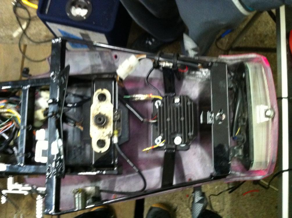 Jetzt kam dann der Teil wo ich nicht mehr mich nicht auskenne, die Elektrik, eine Woche haben meine Jungs da unten in der Halle Kabel und Strippen gezogen bis alles so passte wie es sein sollte. Das war dann so die Halbzeit als Sie das erste mal ansprang und von alleine lief. Leider wurde Sie auch sofort inkontinent, da wir vergessen hatten den Drehzahlmesserausgang dicht zu machen. Die neuen Instrumente haben einen elektronischen Anschluss, und da ist das irgendwie in Vergessenheit geraten.