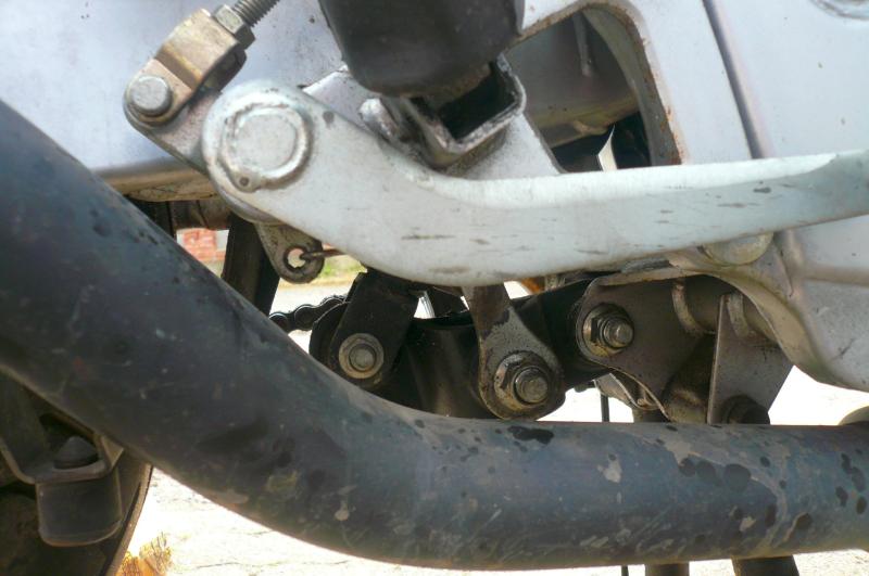 Hinter dem Fußschutz der Rasten ist ne Klemmung mit Verzahnung (Schraube/Mutter M6) am Gewindestab zur Pumpe.