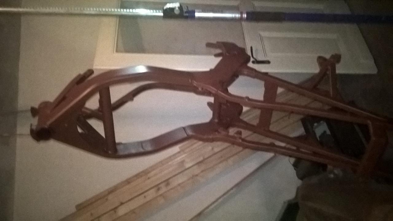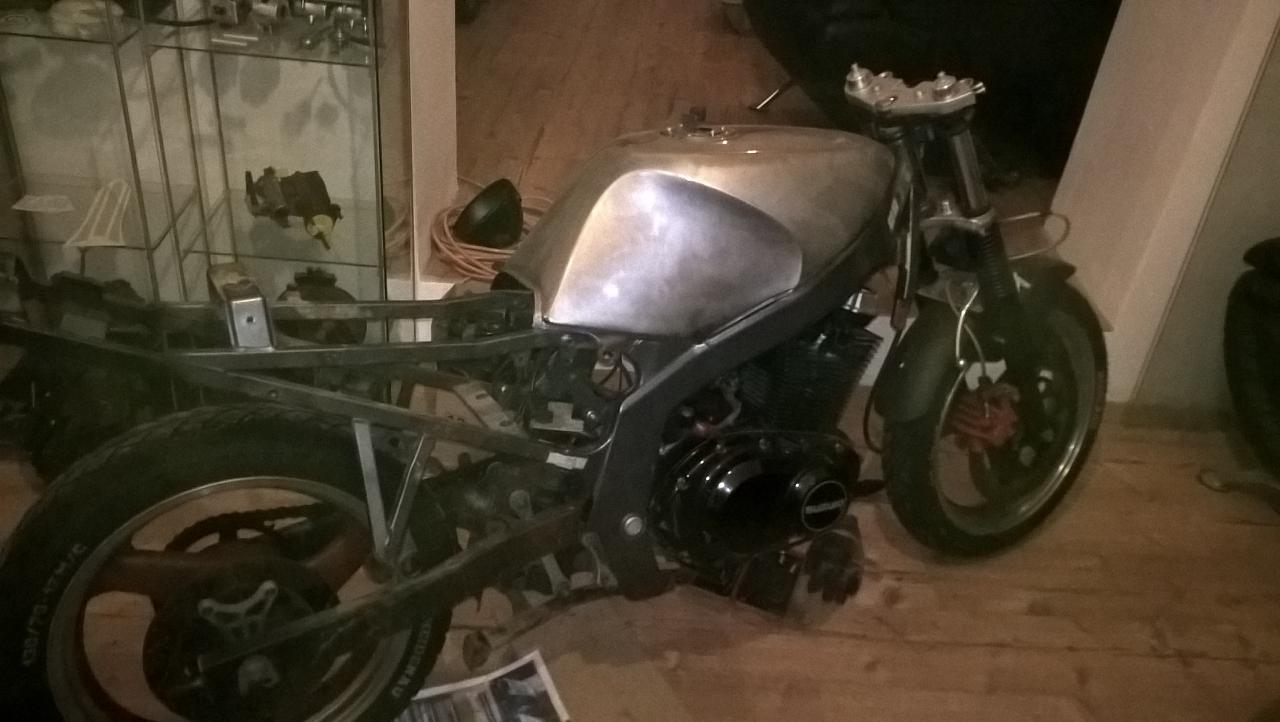 Erstmal die Kiste gefleddert und den Motor zur weiteren Behandlung entnommen. Da sollen die Ventile eingestellt werden und die Seitendeckel poliert werden...mal den Tank aufgelegt,- ich glaube Hochglanzschwarzer Rahmen wird zum Tank passen. Nur mim Heck bin ich immernoch nicht schlüssig. Die Befragung des TÜVs wurde outgesourced,- vielleicht erreicht mein Kumpel was bei den Männern in Blau bezüglich der Rahmenheckänderung...
