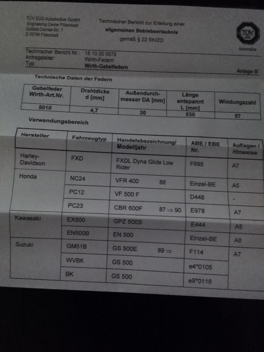 Ich denk okay, dann stimmt da wohl was nicht, lasse ihn die originalen Federn wieder einbauen und schaue mir die Website von Wirth an. Wenn ich da nach meinem Modell/Baujahr filtere, tauchen zwei Gabelfeder-Sets auf, und unter einem steht "...für div. Harley u.a.". Ich schaue nach und sehe, daß ich genau dieses Modell in der Hand halte. Denke mir, Harley und GS500 sind ja jetzt doch zwei verschiedene paar Schuhe, vielleicht ist ja auf der Website was falsch programmiert und der Händler, von dem ich die Dinger gekauft habe, darauf reingefallen. Rufste bei Gelegenheit mal bei Wirth an.