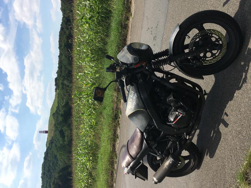 - Bj 1989, Drosselung ausgetragen - Rahmen schwarz - Felgen schwarz - Lack Spezial mit Granitlack aus dem Baumarkt, Checkerflags, used Vintage look, schwarz - Kettenöler verbaut (Rehoiler) - Armaturen geändert, LEDs als Anzeigen, Drehzahlmesser entfernt (braucht kein Mensch) - alter Uvex-Helm als Frontmaske, Visier als Scheibe (mit Zulassung DIN 484 - LED-Tagfahrlicht - geänderter Frontfender aus Alu - SV Bremse vorne - Sturzbügel - geänderte Hupe - Halogenblinker mit lastunabhängem Blinkrelais - Heizgriffe - geänderte Sitzbank (Rockystyle) - FZS 1000 Rücklicht - geänderte Heckverkleidung aus Leder (Rockystyle) - olivgrüne Umhängetasche als Packtasche - alles was irgendwie andersfarbig war, schwarz |