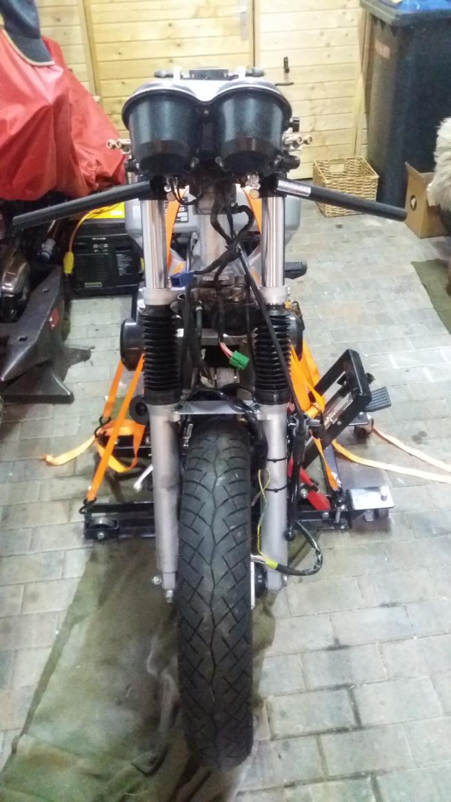 Neuer Fehling Stummellenker verbaut (gab es mit Teile Gutachten für ca. 70 Euro im Netz). Neue Gabelgummis sowie gebrauchten Leder Tankbezug (Bagster) montiert. Als nächstes kommt ein neuer Scheinwerfer mit Gitterverblendung dran und der Heckrahmen wird von mir verschweißt, abgeflext, grundiert und am hinteren Teil neu schwarz matt lackiert. |