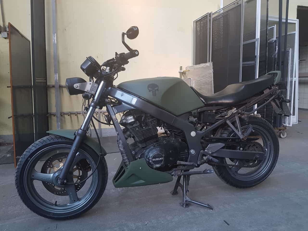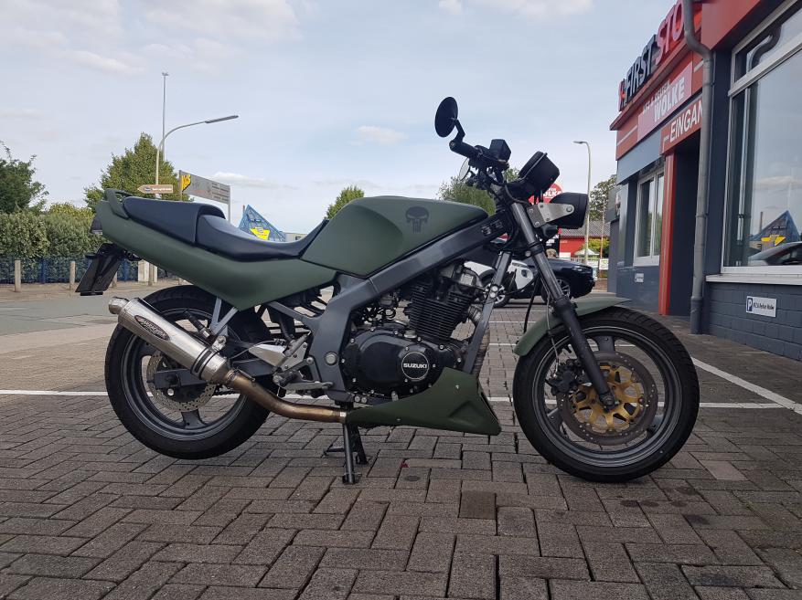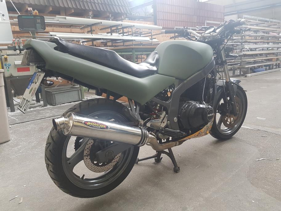 Aber da hat sich vorher schon jemand Mühe mit dem Rahmen gemacht. Und der Schwinge. Und der Gabel. So passend hat Suzuki das nie geliefert.... |