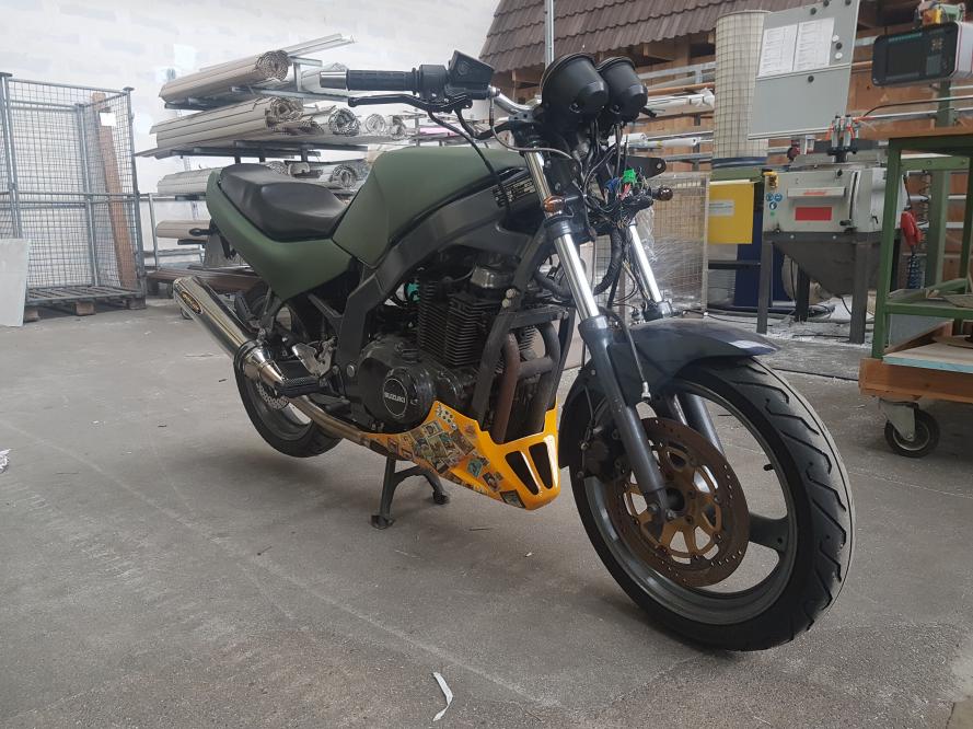 Was hat sich also in den letzten Monaten getan? Natürlich habe ich den hier bemängelten Bugspoiler tiefer gesetzt. Direkt danach gab es einen neuen Bremssattel vorne und andere Spiegel. Es gab Edelstahlschrauben für den Motor, eine neue Kupplung, einen neuen Kettensatz, die Schwingenlager wurden gereinigt und gefettet, den Umlenkhebel gab es von einer Bandit. Eine (bisher unlackierte) Sitzbankabdeckung gab es ebenfalls. Der Endschalldämpfer wurde um 10cm gekürzt, ein offener K&N Filter verbaut und das ganze mit einem Dynojet Stage 3 Kit abgestimmt. Klingt jetzt wie eine große. Die Kiste läuft deutlich besser als original, springt besser an und zieht aus dem Drehzahlkeller deutlich stärker durch. Alles natürlich im Verhältnis. Ich überlege noch, ob sich ein neuer Krümmer bzw. eine komplett andere Auspuffanlage lohnen würde, denn eigentlich möchte ich mir nächstes Jahr was größeres zulegen. Mal sehen. |