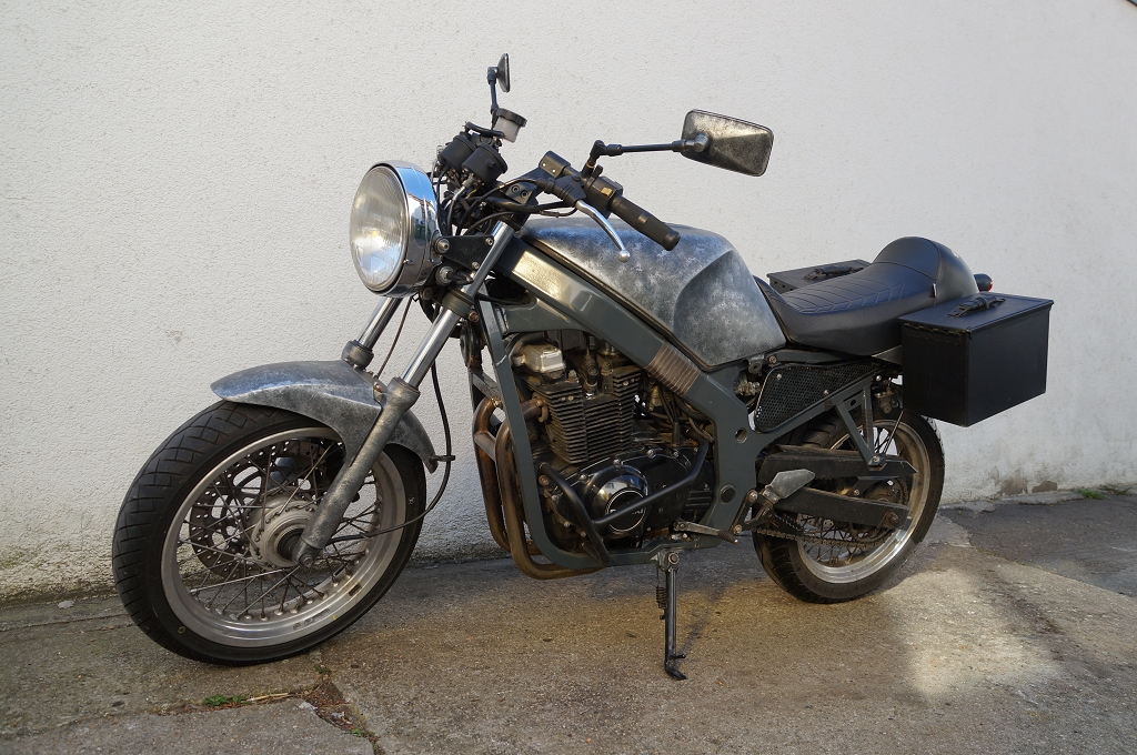 Suzuki GS 500 E, GM 51 B, Baujahr 1992, 55.000 km Umbauten / Änderungen: - Wirth Gabelfedern - Federbein Yamaha R6 RJ15 - Lackierung in braungrün matt - Bugspoiler - SB-Lenker von Spiegler - Lenkerendenspiegel Marke illegal - LED-Rücklicht in schwarz - Mini-Blinker - Doppelscheinwerfer - Barracuda ESD - Frontfender gekürzt - Kurzer Kennzeichenhalter - Ganz viel Kleinkram...