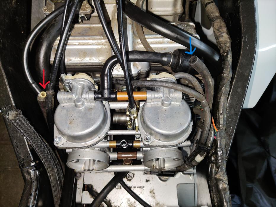 1. Ich habe meinen Vergaser reinigen lassen und bin mir bei 2 Anschlüssen nicht mehr sicher, wo diese anzuschließen sind. Ich habe Sie im Bild markiert.