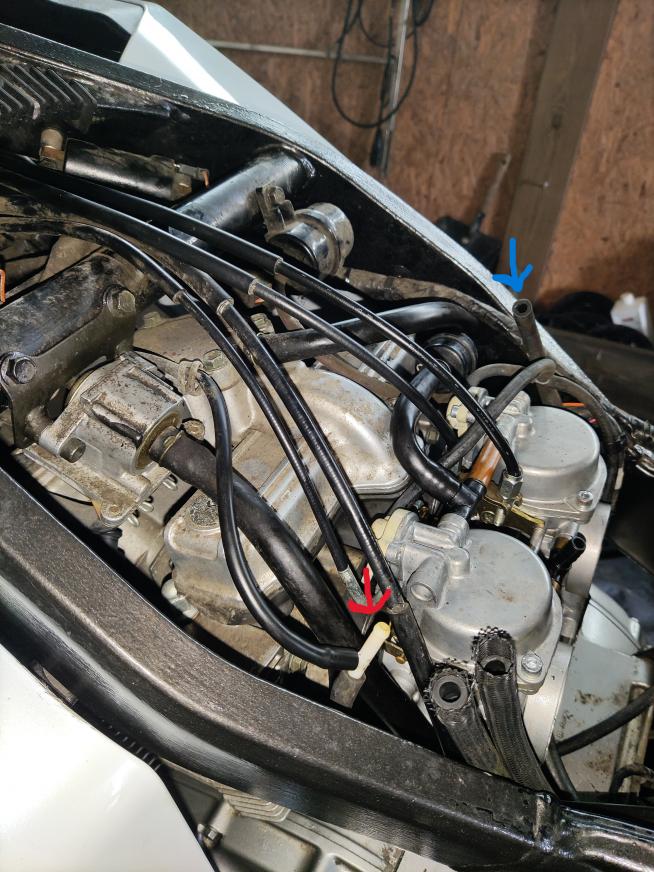 Kannt du mir auf Anhieb sagen, wo die beiden im Bild markierten Anschlüsse/Schläuche zugehören, gehören die überhaupt an den Vergaser?