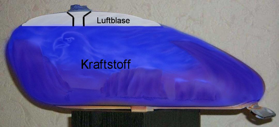 Wie gross ist der Tank an der GS? Laut technischen Daten bei den alten Modellen 17 l, davon 4 l Reserve, bei den neuen 20 l. Das mag theroretisch sogar stimmen, wenn man das letzte Quäntchen Luft absaugt. Praktisch bringt man nie soviel rein, weil der Tankstutzen ein Stück weit in den Tank hinunter ragt. (Das ist auch gut so, weil ganz ohne Luftpolster ist die Sauerei, wenn der Tankinhalt warm wird oder etwas schwappt, vorprogrammiert.) Wieviel geht den nun wirklich rein? Wenn man sofort nachdem man auf Reserve schalten musste zur Tanke fährt, IDR ca 11-12 l bis Unterkante Einfüllstutzen. (Müssten analog beim neuen Tank 14...15 l sein.) Mit viel Geduld, Tankstutzen immer wieder füllen und warten, bis der Spiegel wieder sinkt, auch 1 - 1,5 l mehr. Wie gross ist die Reserve? Erfahrungsgemäss in der Praxis etwa 3.5 l. Damit und mit den je nach Fahrstil und Modell/Jahrgang unterschiedlichen Verbräuchen (alles zwischen 3.8 und 6 l /100 km kann als normal gelten) ergibt sich eine Reichweite bis zur Reserve von 200...350 km. Hab mal ne Zeichnung von einem normal vollgetankten Tank gemacht.. Anhang 10400 Die Luftblase gekommt ihr weitestgehend befüllt, indem ihr - mit eingelegtem 1. Gang beim befüllen des Tanks vor und zurück wippt, damit der Kraftstoff die Luftblase verdrängen kann - den augenscheinlich vollen Tank langsam weiter befüllt ( es steigen dann im Stutzen kleine Blasen auf; die Luftblase wird ebenfalls verdrängt ) Hierbei aufpassen, dass der Kraftstoff nicht zu schnell in den Tank gegeben wird, da ansonsten zu schnell zu viele Blasen aufsteigen und etwas Kraftstoff auf die Tanklackierung tropfen kann.. |