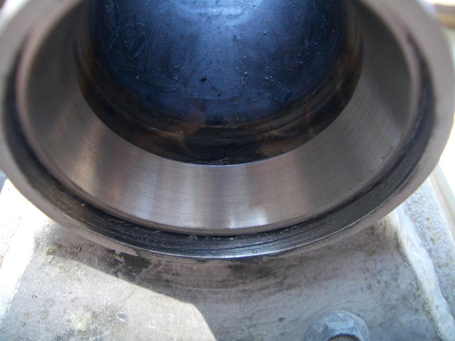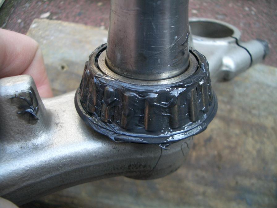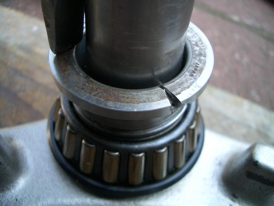 Zum Überprüfen des Lenkkopflagers die GS aufbocken und das Vorderrad entlasten (ein Familienmitglied auf dem Soziussitz oder ein Wagenheber unter den Krümmern leisten da gute Dienste). Am sensibelsten wäre die Kontrolle, wenn man sämtliche Züge und Kabel vom Lenker entfernt, da die immer etwas Widerstand verursachen. Aber ein eingelaufenes Lager bemerkt man auch komplett montiert. Ein typisches Verschleißbild eines LKL ist Rastung: Wenn man den Lenker an den Enden mit Fingerspitzen von einer zur anderen Seite einschlägt, bemerkt man eine spürbare Rastung um die Mittelstellung. Da man die meiste Zeit geradeaus fährt arbeiten sich die Kegelrollen des Lagers mit der Zeit in die Lagerschale ein. Das wird durch ein zu lockeres und (viel mehr noch) durch ein zu strammes LKL beschleunigt. Aber auch perfekt eingestellt hält ein LKL nicht ewig. Für den Test auf Spiel im LKL packt man von vorn die Gabelholme an den unteren Enden und wackelt vor und zurück. Spürt man dort Spiel, ist das LKL zu locker. Zu fest ist das LKL, wenn der Lenker nicht in einem sachten Schwung von einer zur anderen Seite dreht. Aber zum LKL-Einstellen kommen wir am Ende noch ;) Woher bekomme ich ein neues Lenkkopflager? Die teuerste Variante ist sicherlich der Suzukihändler (ca 70€). Bei Louis, Polo und Co gibt es das LKL auch (ca. 40€), wobei man dort aufpassen/nachfragen muss, ob die untere Staubkappe dabei ist. Es geht an sich aber auch ohne. Die obere Staubkappe kann man weiter verwenden. Ohne Staubkappe gibt es passende Lager für wirklich kleines Geld (ab ca 12 € inkl. Versand) in Onlineshops oder bei Ebay. Ich habe dort schon mehrfach Lager gekauft und hatte nie Probleme (nur, dass eben die untere Staubkappe nicht dabei ist). Die LKL-Bezeichnungen / Maße - falls jemand zum Wälzlagerhändler seines Vertrauens geht (vorher nach dem Preis fragen, damit es keine böse Überraschung gibt) unten: RT 30X55X17 BEA oben: RT 25X47X15 BRG Bezeichnung des GS500 DIN-Kegelrollenlager-Satzes: SSH901 Wie komme ich an das LKL? Dazu muss man ein paar große Teile demontieren, ist aber an sich keine besondere Schwierigkeit: Vorderradachsmutter lösen, die beiden Bremssattelhalteschrauben lösen (das sollte man tun, bevor man die Maschine aufgebockt und das Vorderrad entlastet hat) und den Bremssattel vorsichtig von der Scheibe ziehen (Vorsicht, dass der Felgenlack nicht beschädigt wird). Den Bremssattel kann man mit Schnur/Draht an zB die Zündkerze binden, damit der nicht im Weg ist. Jetzt die Felge hochhalten und die Steckachse herausziehen. Felge nach vorn herausrollen und auf den Verbleib der Achsdistanz achten. An der Tachoschnecke ist eine kleine Kreuzschlitzschraube. Wenn man die herausdreht kann man die Tachowelle aus der Schnecke ziehen und aus der Führung fädeln. Jetzt kommen die Gabelholme komplett mit Fender raus. Dazu die obere (Inbus) und untere (14er SW Sechskant) lösen und die Gabelholme nach unten herausziehen/herausgleiten lassen. Hier auf den Scheinwerfer achten. Wenn die Holme raus sind kommt der einem samt Halter entgegen. Hängt aber sicher am Kabelbaum. Jetzt wird die große verchromte Hutmutter (Lenkkopfschaftschraube) oben an der silbernen Lenkerhaltebrücke abgeschraubt und die silberne Brücke kann samt schwarzer oberer Gabelbrücke abgenommen werden und mit dem Rest der Kabelei baumeln. Nun die Kronmutter lösen (am besten einen passenden Hakenschlüssel verwenden, aber zur Not tut es auch ein Durchschlag/Meißel/Schraubendreher + Hammer) und schon rutscht die untere Gabelbrücke samt Steuerachse nach unten heraus. Oben am Steuerkopf kann man jetzt einfach das obere Lager herausnehmen und sieht die obere Lagerschale. So eine (etwas größere) Lagerschale ist auch unten im Steuerkopf. An der Lauffläche sieht man jetzt ganz gut die Rastmarken als dunkle Abdrücke (auch wenn die nicht schlimm aussehen und nicht fühlbar sind, sind sie doch die Ursache): Anhang 4950 Wie bekomme ich die alten Lagerteile raus? Ich habe mir zum Austreiben der Lagerschalen einen dünnen Meißel im Baumarkt besorgt (<4€). Innen ragen jeweils die Ränder der Lagerschalen wenige Millimeter in den hohlen Steuerkopf hinein. Genau das ist die Angriffsfläche für den Meißel: Anhang 4951 Nach und nach kann man so mit Hammerschlägen die Lager heraustreiben (das untere von oben, das obere von unten). Dabei schön gleichmäßig reihum meißeln, damit das Lager nicht verkantet und irgendwann dann auch drauf achten, dass besonders die obere Schale nicht wegfliegt und vielleicht noch Kratzer am Tank macht. Jetzt hat man die beiden alten Lagerschalen in der Hand: Anhang 4954 Diese nicht gleich wegwerfen, die brauchen wir noch zum eintreiben der neuen Lagerschalen: Anhang 4955 Nun bleibt noch das untere Lager auf der Steuerachse: Das herunterzubekommen ist nicht so einfach. Suzuki hat dafür einen RIESEN Abzieher (in der Größe sind die schwer zu bekommen und auch sehr teuer). Ich habe auch schon davon gehört, den Innenring des unteren Lagers mit einem Durchschlag die Steuerachse hoch herunterzutreiben (Brücke dabei im Schraubstock einspannen). Das habe ich mehrfach probiert mit dem Ergebnis, dass die winzigen Angriffsstellen für den Durchschlag wegsplittern bevor sich das Lager auch nur einen Millimeter bewegt hat. Aber vielleicht fehlt mir da nur die richtige Technik... :roll: Ich beschreibe hier die Methode, mit der ich schon mehrere LKL erfolgreich gewechselt habe. Am unteren Lager sieht man die Kegelrollen und ihren Käfig. Der kann aus Metall oder Kunststoff sein. Den knipsen wir mit einem Seitenschneider auf, entfernen die Kegelrollen und haben nun den blanken Innenring auf der Steuerachse vor uns: Anhang 4956 Der wird eingeschnitten und mit einem gezielten Hieb mit Hammer und Meißel gesprengt. Dazu benutze ich ein Dremelplagiat (der originale Dremel tut es natürlich auch ;) ), welches man für 10-20€ im Baumarkt oder beim Discounter mit massig Zubehör bekommt. Dabei sind auch immer kleine Trennschei