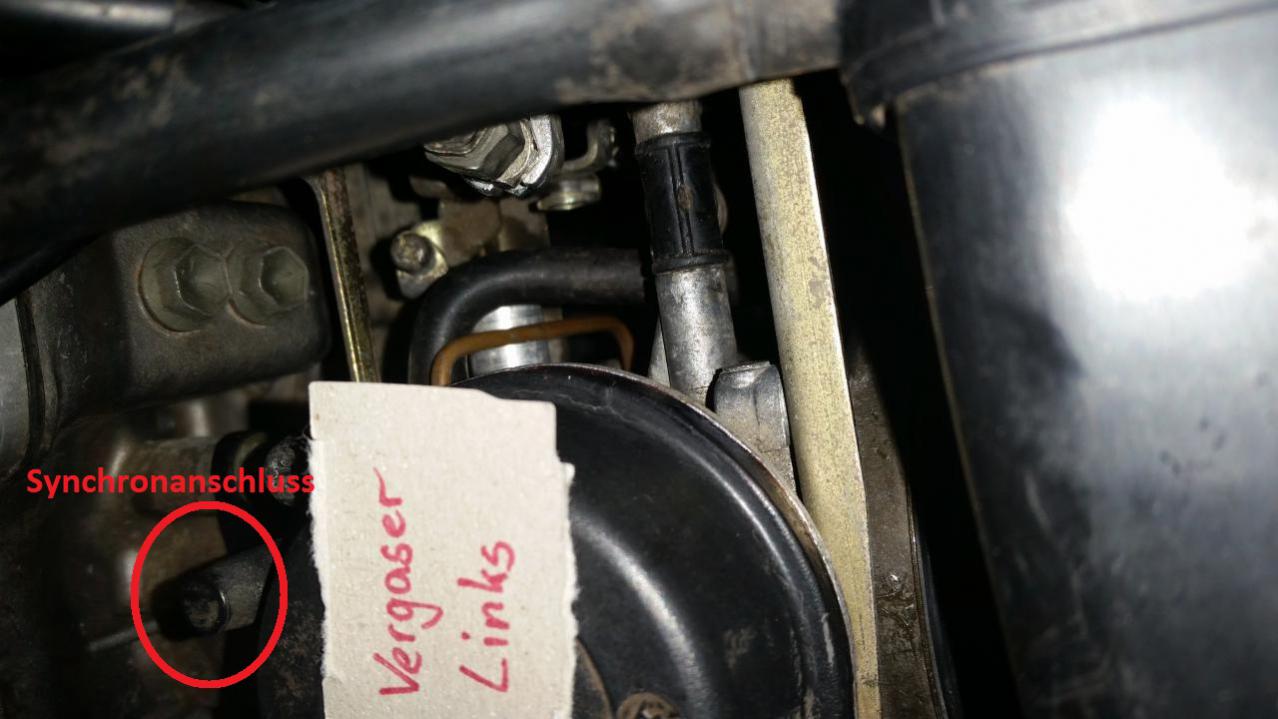 Auf jeden fall ist der Choke auf den Bildern geöffnet... prüf mal, ob da noch spiel in dem Seilzug ist. Im Zweifelsfall ist der zu sehr gespannt und du bekommst daher ein zu fettes Gemisch. Was diesen Komischen Schlauch mit Imbussschraube da angeht... der hat da eig. nix zu suchen... Da hat vor dir schon mal jemand versucht irgend etwas abzudichten. Es sieht auch so aus als wäre an der Vergaserentlüftung kein Schlauch dran aber das kann täuschen. Auf dem Bild vom linken Vergaser hab ich mal die Synchronanschlüsse markiert von denen wir geredet haben.