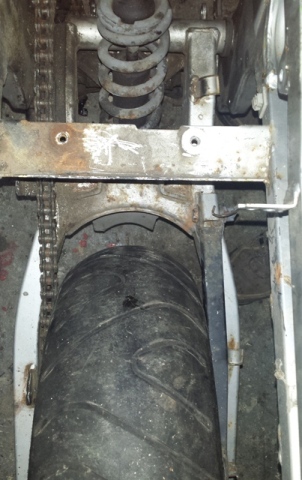 Und der 4,5"-Felge in der Original-Schwinge. Den kleinen Seitendeckel rechts werde ich wohl durch ein Carbon-Teil ersetzen. |