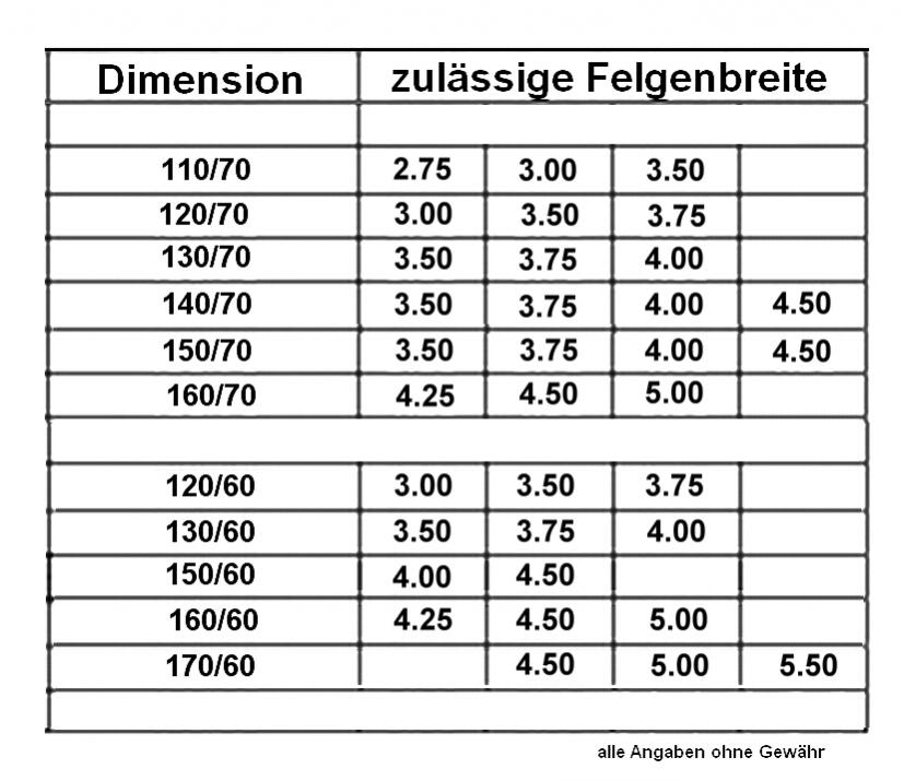 Grundsätzlich sind alle in der untenstehenden Tabelle aufgeführten Kombinationen von Felgenbreiten und Reifendimesionen zulässig und können nach einer Begutachtung durch die zuständige Prüfstelle in die Fahrzeugpapiere eingetragen werden .