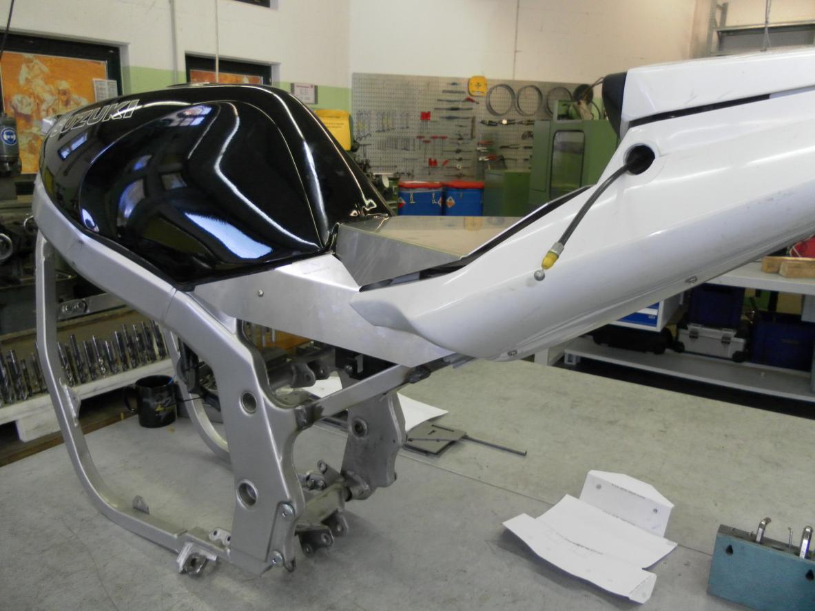 Da in unser Plan Ein Neues heck gedacht war und wir ein Motorrad bauen was na zu en Serien Motorrad aus sehen soll. Wollten wir erst ein Suzuki heck nehmen aber dar ein GSXR1000 heck zu breit ist und wrickt haben wir ei R6 2003 heck genommen.