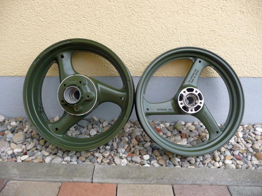 Gerade meinen Felgensatz (GS-Standard vorn + Bandit 600 hinten) + Kleinteile (Batteriehalter, Tankhalter, Cockpitbrille, Seitenständer, Gabelstabi) vom pulverbeschichten abgeholt.