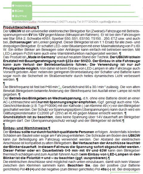 Hinweis: Befindet sich an Ihrem Fahrzeug nur eine Blinkkontrollleuchte oder eine nachgerüstete akustische Blinkkontrolle, ist dieser Blinkgeber nicht zu empfehlen - verwenden Sie dann entweder das Kellermann-Blinkrelais (Best.Nr. 10032036) oder Leistungswiderstände.