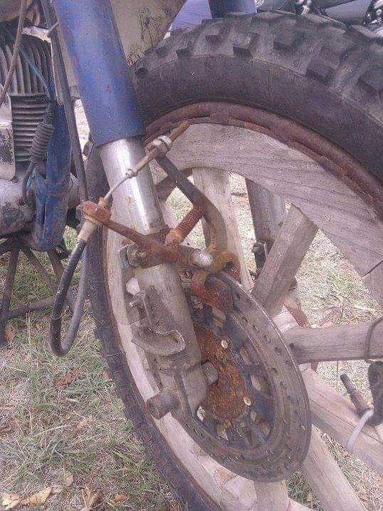 Die "Bremszange" ist an und für sich schon grenzgenial, aber das Rad selber noch viel mehr! Stammt wohl aus einem alten Heuwagen oder Scheibtruhe (für die Freunde nördlich des Weisswurschtäquators: Schubkarre)