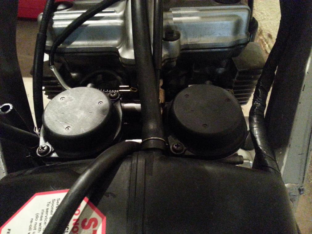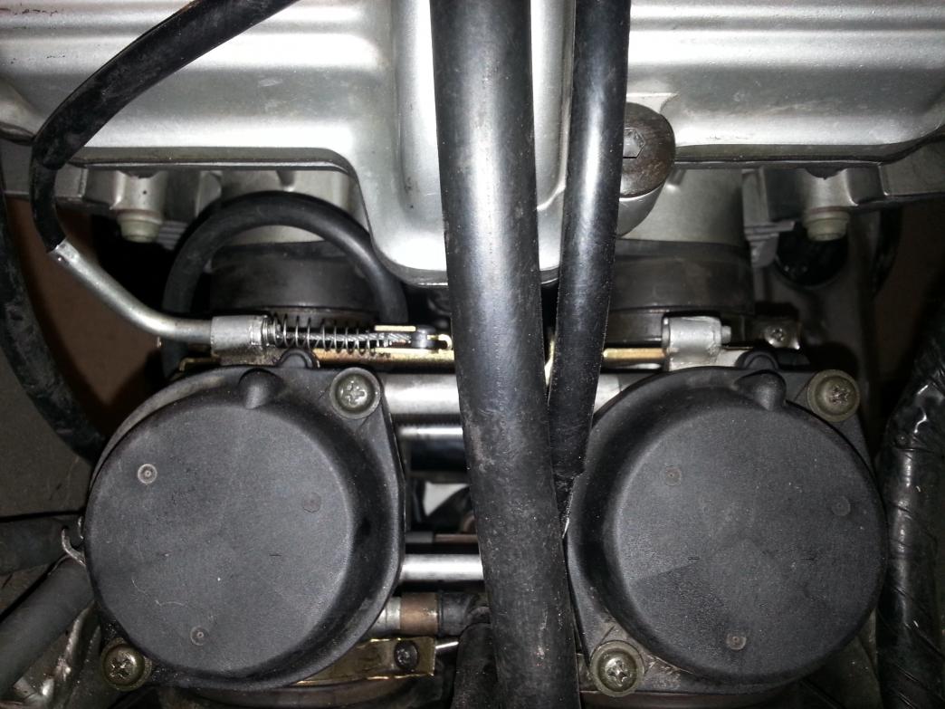 Die "alten" Vergaser haben auf den Schwarzen Unterdruckdeckeln der Vergaser Synchronisationsanschlüsse. Da gehören Gummikappen drauf und ein O-Ring drunter, damits keine Falschluft zieht.