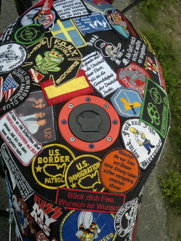 So hier die die Bilder vom neuen gepatchten F-Tank und der Gimbelverkleidung. Insgesmt wurden nun 120 Patches vernäht und ebensoviele Aufkleber.