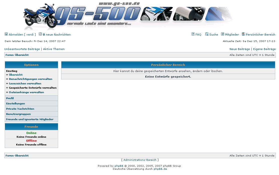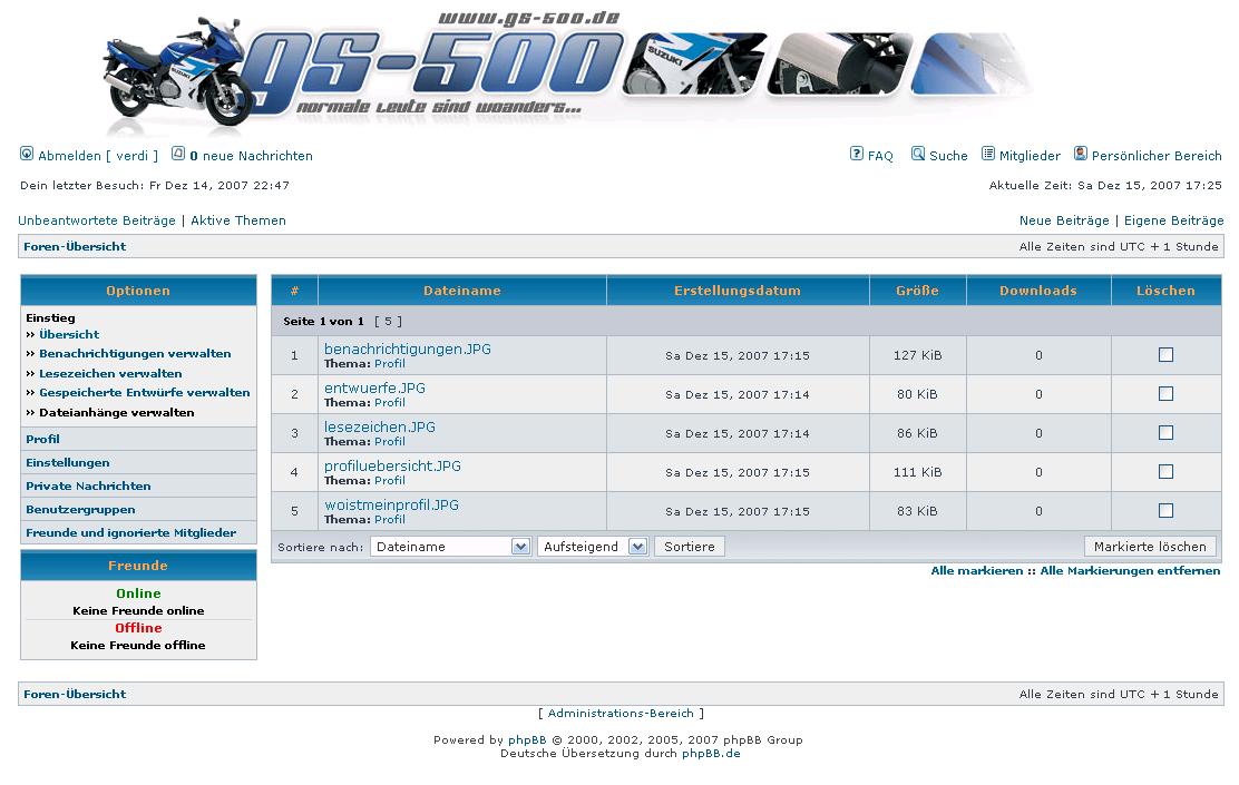 1. Wo ist mein Profil eigentlich? Dein Profil heisst jetzt "Persönlicher Bereich" und Du findest es rechts oben. [attachment=1:3uvzztbs]woistmeinprofil.JPG[/attachment:3uvzztbs] 2. Der "Persönliche Bereich" in der Übersicht [attachment=2:3uvzztbs]profiluebersicht.JPG[/attachment:3uvzztbs] 3. Menüpunkt "Benachrichtigungen verwalten" [attachment=3:3uvzztbs]benachrichtigungen.JPG[/attachment:3uvzztbs] Hier kannst du die Benachrichtigungen über neue Beiträge in Threads und abonnierten Foren ändern. 4. Menüpunkt "Lesezeichen verwalten" [attachment=4:3uvzztbs]lesezeichen.JPG[/attachment:3uvzztbs] Im phpBB3 kannst Dur dir Lesezeichen für bestimmte Threads setzen um sie einfacher wiederzufinden. Diese Lesezeichen kannst du hier verwalten. 5. Menüpunkt "Gespeicherte Entwürfe verwalten" [attachment=5:3uvzztbs]entwuerfe.JPG[/attachment:3uvzztbs] Wenn du einen neuen Beitrag schreibst kannst du ihn statt ihn abzuschicken auch als Entwurf speichern um später weiterzuschreiben. Die gleiche Funktion bieten auch viele Mail Programme. Hier kannst du deine entwürfe verwalten. 6. Menüpunkt "Dateianhänge verwalten" [attachment=0:3uvzztbs]dateianhaenge.JPG[/attachment:3uvzztbs] Hier findest du eine übersicht aller von dir hochgeladenen Dateianhänge und wo sie verlinkt sind.