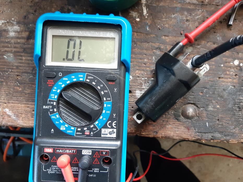 Dann habe ich auch eine komplett neue Zündkerze verwendet, aber ohne Zündfunken. Im Anhang ist der Versuch einer Messung der Sekundärspule. Egal, welche Ohm-Einstellung ich verwende, das Ergebnis ist immer 0. Auch wenn ich die Kontakte der inneren Spule verwende, habe ich immer noch keinen Widerstand (sollte logisch sein, aber ich habe es probiert). |