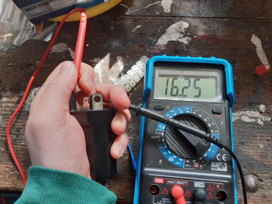 Ich habe außerdem alles protokolliert: # Inspektionen Protokoll # 2023 sowie davor Bis März '23: - Tank entrostet - Schläuche erneuert - Schlauchklemmen angebracht - Dichtmasse an Tankdeckel und an Benzinhahn 1 angebracht - Benzinhahn 2 an der Verschraubung teilweise abgebrochen, konnte aber mit Muttern eingeklemmt und fixiert werden - Kettenspray auf Kette - Batterie mehrfach aufgeladen - Benzinfilter installiert Bis 25.05.2023: - Sturzschäden behoben: - Linke Heckverkleidung, Getriebe eingerastet, Kupplung auseinandergenommen und zusammengesetzt, Lenker ersetzt, linker Spiegel ersetzt -Folgeschäden: - Durch zu hohes Drehmoment ist in der Kurbelwelle eine Schraube abgerissen, versuche diese zu kleben - Durch zu hohes Drehmoment ist die rechteste Schraube bei dem Deckel von dem Kurbelwellengehäuse abgerissen. Diese muss noch herausgenommen und ersetzt werden. Danach: - Zündimpulsgeber angeschweißt, muss noch überarbeitet werden - Benzinhahn vorverlegt - Vergaser synchronisiert - Lenkererhöhung - Ventilspiel kontrolliert Bis 29.11.2023 - Zündimpulsgeber stabilisiert mit drei Elektroden, die hingeschweißt wurden Bis 06.03.2024 - Hinterrad: - Zur intensiven Reinigung komplett zerlegt und mit Petroleum gereinigt, sowie neu eingefettet - Bremsscheibenschraube beschädigt, daher keine Schraubensicherung bei einer Schraube - Zahnrad-Schraubenhalterung beschädigt, aber Schraube trotzdem festgezogen ⇒ Wie oft hält es die Halterung noch aus ? - Offenes Kugellager durch geschlossenes ersetzt, da das Fett alt gewirkt hat - Luftfilter und Ölfilter erneuert - Bremsflüssigkeit erneuert und Keramikpaste aufgetragen; dabei Bremsen zerlegt und mit Petroleum und Bremsenreiniger gesäubert - Zylinderkopfschraube ersetzt und Keramikpaste aufgetragen - Bei Achse Schraubensicherung aufgetragen und nach Gefühl festgezogen - Standard-Knochen verbaut, um das Heck in die normale Position zu bewegen - Fett in der gesamten Schwinge erneuert, nachdem alle Achsen mit Petroleum gereinigt wurden - Kette neu eingefettet, davor mit Petroleum gereinigt - Öl abgelassen - Zündkontakt zur Reparatur mit Epoxidharz entfernt - Hilfstank aus Trinkflasche im Herstellungsprozess - Zündimpulsgeber durch Schweißgerät verstärkt - Als Konsequenz die Kupplung zerlegt und von Staub gereinigt Bis 07.04.2024 - Pickup von Zündimpulsgeber mit Epoxitharz verstärkt - CDI getauscht, da alte CDI aber doch in Ordnung war, wurde die alte wieder verwendet - Bei Zündspulen hatte die Primärwicklung ca. 4 KOhm, die Sekundärwicklung ca. 16 KOhm Bis 13.04.2024 # Kupplung - Versuch, diese neu einzustellen - Die Kupplung greift nun gut, aber das Hinterrad läuft auch bei losgelassenem Hebel mit - Es gibt also noch zuviel Kontakt # Zündsystem - neue Zündplatte eingebaut; diese scheint harmonisch zu funktionieren (siehe Video): [00096(1).mp4](https://prod-files-secure.s3.us-west...9/00096(1).mp4) - neue Zündspule eingebaut - Immer noch kein Funke - Lichtmaschine geöffnet und optisch inspiziert; sieht brauchbar aus: ![20240413_144130[1].jpg](https://prod-files-secure.s3.us-west...13_1441301.jpg) - Gleichrichter ausgesteckt, aber immer noch kein Zündfunke - Bei dem Versuch, den Gleichrichter kurzzuschließen ist die Sicherung durchgebrannt - Hintergrund: Es hätte sein können, dass der Stromkreis geschlossen werden muss - Es gibt einen Kontakt zwischen den Kühlrippen und dem Pluspol der Batterie; nach dem Multimeter lieg so die Standard-Spannung von ca. 12,4 Volt an - Nach Austausch der Sicherung sind folgende Werte mit dem Multimeter entstanden: - Batterie : ca. 12,3 Volt - Zündspule: Das Orange Y-Kabel hat zum Plus - Pol der Batterie eine Spannung von 11,3 Volt - Batterie Plus Pol mit Kühlrippen vom Zylinder: 12,3 Volt Demenstsprechend dürfte die Sekundärspule einen geschlossenen Stromkreis haben. - CD angestecktI: Das Orange-Weiße Kabel ist mit dem Plus-Pol der Zündspule verbunden und die anderen mit dem Minus-Pol. - Versuch I: Zündung AN: - Hier ist die schwarze Multimeter-Elektrode stets mit dem - Pol der Batterie verbunden. - Wenn man die rote Elektrode auf das Orange-Weiße Kabel oder das Weiße oder das Schwarz-Gelbe gibt, dann erhält man wieder 11,3 Volt. Bei dem Schwarz-Weißen Kabel kommt gar kein Strom zustande. - Versuch II: Zündung AUS: - Hier ist die schwarze Multimeter-Elektrode stets mit dem + Pol der Batterie verbunden. - Wenn man die rote Elektrode auf das Orange-Weiße Kabel oder das Weiße oder das Schwarz-Gelbe gibt, dann erhält man wieder 11,3 Volt. Bei dem Schwarz-Weißen Kabel gibt es 12,4 Volt. - CDI komplett abgesteckt: - Wenn man nun das Schwarz- Weisse Kabel mit der schwarzen Multimeter - Elektrode verbindet, dann hat die rote Elektrode zu allen anderen einen Kontakt und misst ca. 11,8 Volt - alte und neue Zündspulen direkt getestet - Das orange Kabel vom Kabelkanal am Pluspol, ein weiteres Zusatzkabel, das mit dem Minuspol der Batterie verbunden wurde, wurde am Minuspol der Zündspule befestigt - Die Zündkerze wurde in den Stecker gegeben und an die Kühlrippen gehalten - Ergebnis: Beide Spulen haben Funken erzeugt; die neuen Spulen haben einen stärkeren Funken erzeugt # Geplantes Vorgehen - Mit neuem Multimeter Folgendes prüfen - Durchgang der Leitungen - Impulsgeber - Output der CDI - Lichtmaschine: - Direkter Zwei - Phasen - Output - Ausgang des Gleichrichters Im Anhang gibt es ein Bild von der Lichtmaschine. Ich würde gerne als nächstes mit einem Osizlloskop den Input und den Output der CDI machen. Aber das dauert noch, bis meins geliefert wurde. |